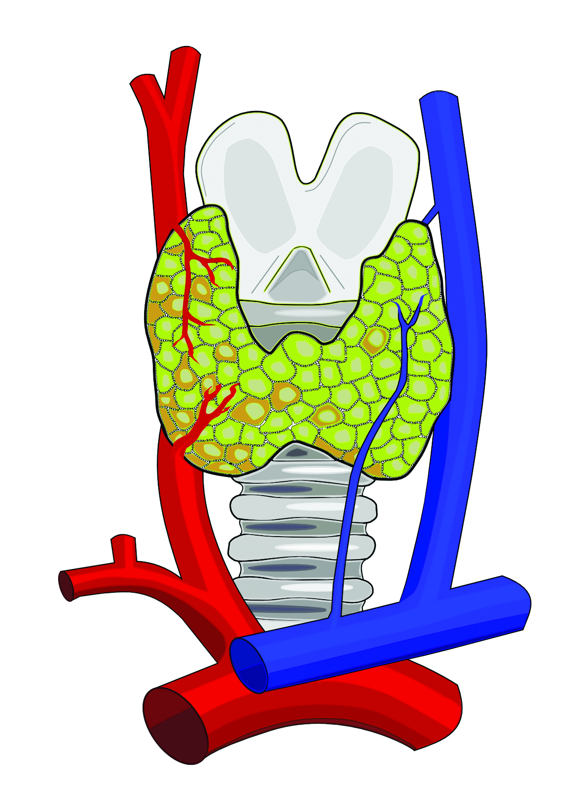 This butterfly-shaped gland sits at the base of the throat. One of the chief functions of the thyroid is the production of the hormone, thyroxine (T4), and the conversion of this hormone into triiodothyronine (T3) as needed for metabolism.