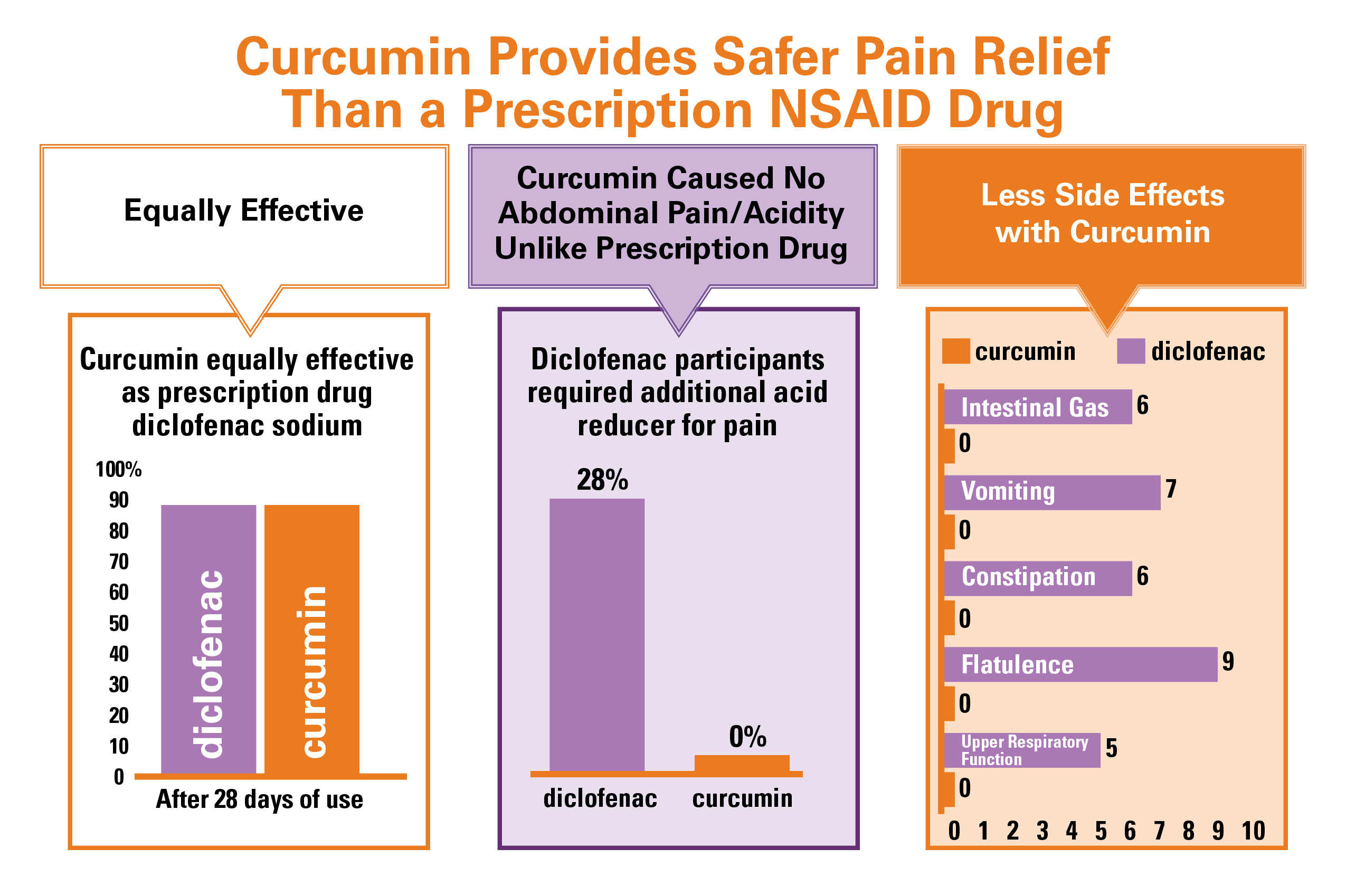 Curcumin relieves pain and also stops inflammatory damage to the joints through many pathways, helping your body heal and not just masking underlying problems. This clinical study compared a curcumin blended with turmeric essential oil, a source of ar-turmerone (BCM-95®), which enhances its absorption and blood retention, to a commonly used prescription NSAID drug, diclofenac sodium (one brand name for this drug is Voltaren).