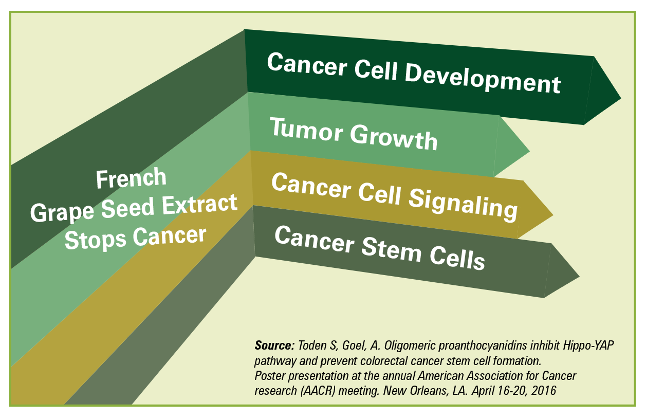 Breakthrough research at Baylor University in Texas has examined the effect of a standardized OPC extract from French grape seed (VX1®) on cancer stem cells—the “seeds” left behind after chemotherapy drugs kill cancer cells. These stem cells can otherwise lead to cancer recurrence and new tumor formation. The scientists at Baylor found that the OPCs from French grape seed eliminated cancer stem cells by inhibiting a pathway in the body called HIPPO-Yap. This pathway is necessary for cancer stem cell survival and is known to lead to cancer cell formation.