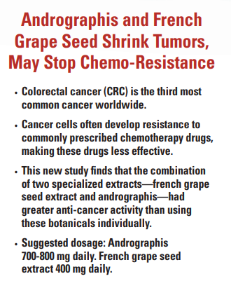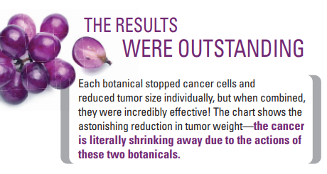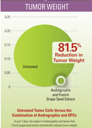 The second botanical, French grape seed extract, has also been used in a number of cancer-related studies, and found to prevent the return of tumors. Like andrographis, it also enhances the effectiveness of the chemotherapy drug 5-FU. It is standardized to 99 percent polyphenols and 80 percent tannin-free oligomeric proanthocyanidins (OPCs)— cancer-fighting components of the ingredient. It is a tannin-free extract so it contains only low molecular weight OPCs that are readily absorbable. In fact, that’s one reason that this grape seed extract was chosen for this study and for leading cancer research during the past few years—it gets to the source of the problem better than other grape seed extracts.