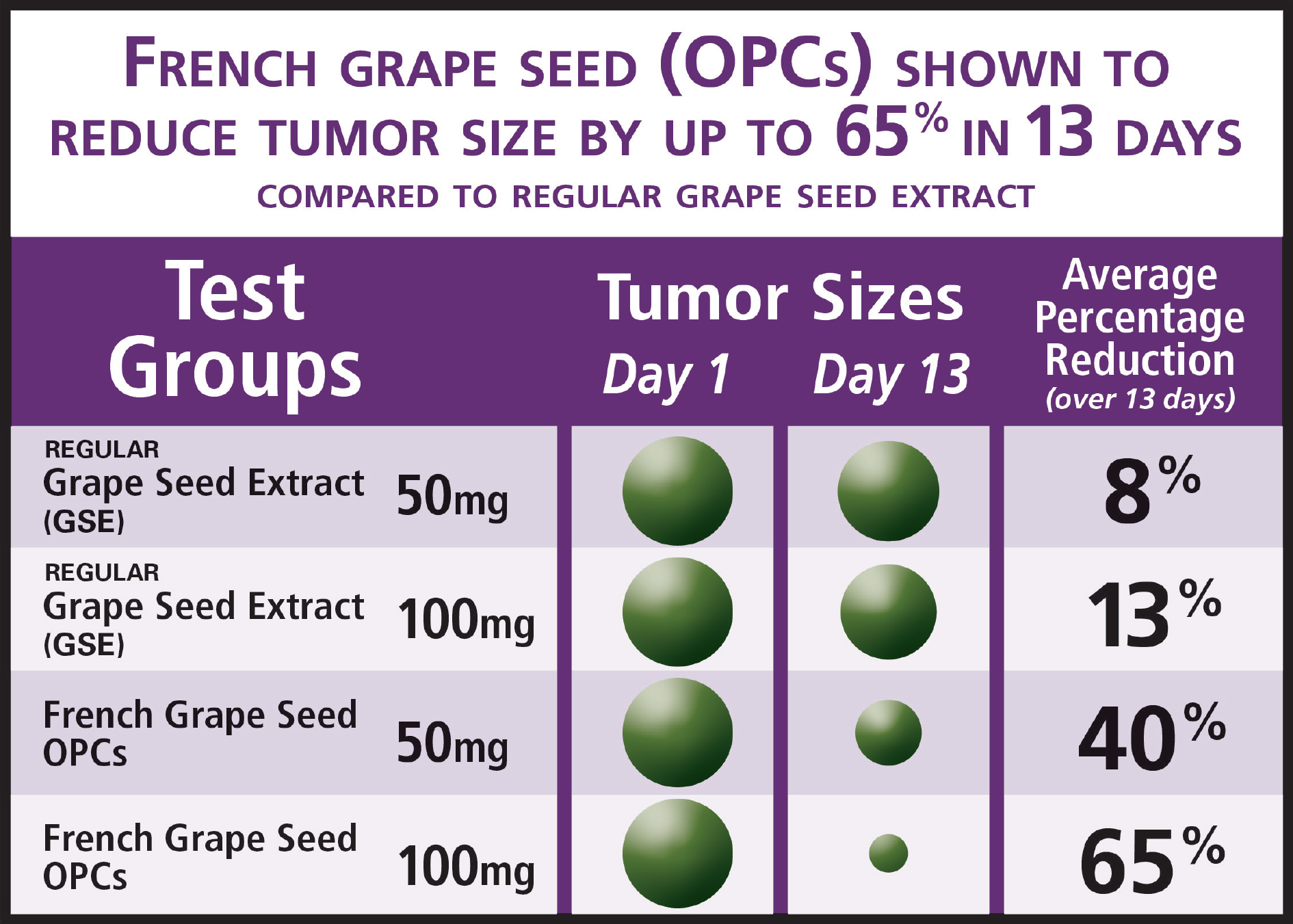 OPC’s from French Grape Seed Extract show great promise in the fight against cancer. Additionally, this study demonstrates that a specific grape seed OPC extract with small, absorbable compounds outperforms standard grape seed extract that contains large tannins that cannot be absorbed. This is why researchers will be focusing on extracts proven to contain only small, absorbable OPC’s.